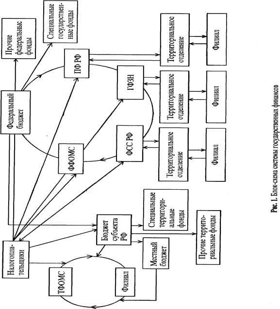 Внебюджетные социальные фонды тесно увязаны с бюджетом и между собой (см. рис. 1 ). Разнообразие внебюджетных фондов обусловливает сложные многоступенчатые связи между этими фондами и другими звеньями финансовой системы. Различают односторонние, двусторонние и многосторонние финансовые связи.