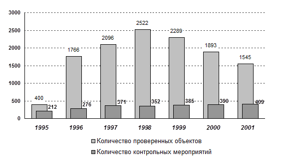В 2001 году Счетной палатой проведено 409 контрольных мероприятий, в том числе 34 – по поручениям палат Федерального Собрания Российской Федерации, обращениям членов Совета Федерации и депутатов Государственной Думы и запросам органов государственной власти. Контрольными мероприятиями было охвачено 1545 предприятий и организаций, расположенных на территориях 55 субъектов Российской Федерации. В динамике ситуация выглядит следующим образом:
