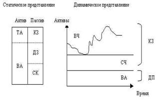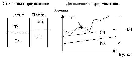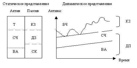 ВА — внеоборотные активы; ТА—текущие активы (ТА = СЧ + ВЧ); СЧ—системная часть текущих активов; ВЧ—варьирующая часть текущих активов; КЗ—краткосрочная кредиторская задолженность; ДЗ—долгосрочный заемный rапитал; СК—собственный капитал; ДП—долгосрочные пассивы (ДП = СК +