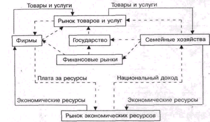 Модель экономики № 3 — экономика с государственным сектором. Государство получает от семейных хозяйств налоги, которые образуют важнейший источник доходов государственного бюджета. Фирмы тоже платят налоги государству, но в данной ситуации в качестве условия предполагалось, что владельцами всех экономических ресурсов являются только семейные хозяйства, поэтому именно они выступают в роли плательщиков налогов. В свою очередь население получает из госбюджета пенсии, пособия и т. п. Расходы государства определяются размерами государственных закупок товаров и услуг. Если расходы превышают доходы и образуется дефицит государственного бюджета, то государство прибегает к займам на финансовом рынке. Основной формой таких займов является выпуск и размещение государственных ценных бумаг.