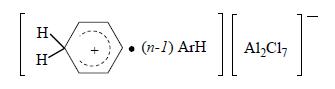 Хлорид алюминия в твердом виде практически не растворим в углеводородах и слабо катализирует реакцию. Однако по мере выделения НСl хлорид алюминия начинает превращаться в темное жидкое вещество, также не растворимое в избытке углеводорода (комплекс Густавсона), которое обладает высокой каталитической активностью, и реакция постепенно ускоряется. Его можно приготовить, пропуская НСl при нагревании через суспензию АlСl3 в ароматическом углеводороде. Комплекс представляет собой соединение АlСl3 и НСl с 1-6 молекулами ароматического углеводорода, одна из которых находится в особом структурном состоянии положительно заряженного иона (σ-комплекс), а остальные образуют сольватную оболочку