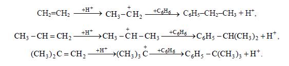 Алкилирование олефинами в большинстве случаев протекает по ионному механизму через промежуточное образование карбокатионов и катализируется протонными и апротонными кислотами. Реакционная способность олефинов при реакциях такого типа определяется их склонностью к образованию карбокатионов: