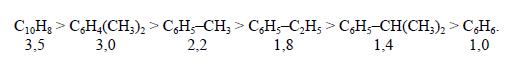 Влияние строения ароматического соединения при реакциях алкилирования в общем такое же, как при других процессах электрофильного замещения в ароматическое ядро, но имеет свои особенности. Реакция алкилирования отличается сравнительно малой чувствительностью к электронодонорным заместителям в ядре. Так, активирующее влияние алкильных групп и конденсированных ядер при катализе реакции АlСl3 изменяется следующим образом (для бензола величина принятаза 1,0):