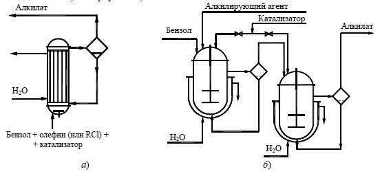 Периодический процесс проводят в реакторе с мешалкой и охлаждающей рубашкой, а иногда – со змеевиком. В реактор загружают бензол и АlСl3 или каталитический комплекс (10…20 % от объема реакционной массы), после чего при перемешивании добавляют жидкий олефин или хлорпроизводное, поддерживая заданную температуру. Переход к непрерывному процессу в случае жидких алкилирующих агентов осуществляется двумя основными способами.