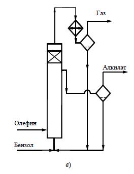 Алкилирование ароматических углеводородов газообразными олефинами проводят в барботажных колоннах (рис. 1в), внутренняя поверхность которых защищена от коррозии кислотостойкими плитками. Жидкая реакционная масса, заполняющая колонну до бокового перелива, состоит из каталитического комплекса АlСl3 (20…40 % (об.)) и нерастворимой в нем смеси ароматических углеводородов. В нижнюю часть колонны подают сухой бензол и олефиновую фракцию, которая барботирует через жидкость, интенсивно ее перемешивая. Жидкая реакционная масса стекает через боковой перелив в сепаратор, где отстаивается более тяжелый каталитический комплекс, возвращаемый в низ алкилатора, а алкилат поступает на дальнейшую переработку.