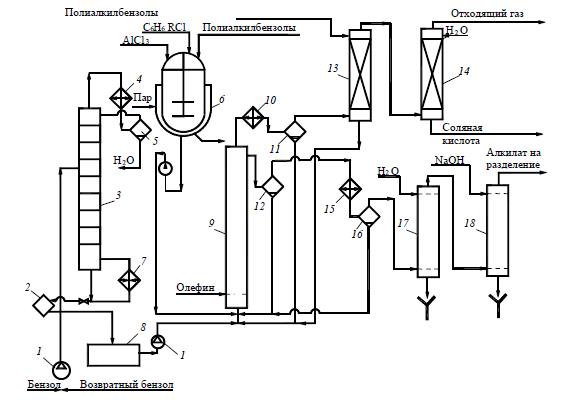 1 – насос; 2– теплообменник; 3– колонна осушки бензола; 4, 10– конденсаторы; 5– сепаратор; 6– аппарат для получения каталитического комплекса; 7 – кипятильник; 8– сборник; 9– алкилатор; 11– газоотделитель; 12, 16– сепараторы; 13– абсорбер; 14 – водяной скруббер; 15– холодильник; 17, 18– промывные колонны
