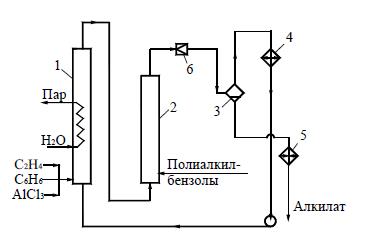 1 – алкилатор; 2– переалкилатор; 3– сепаратор; 4– конденсатор; 5– холодильник; 6– дроссельный вентиль