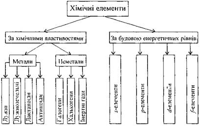 Нині відомо вже 112 хімічних елементів, їх класифікують по-різному, залежно від ознаки, яка береться в основу класифікації (схема 1).