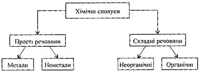У наш час відомо понад 12 мільйонів речовин, і цей список, мабуть, чи не щоденно поповнюється. Згідно з сучасними уявленнями про хімічний зв'язок усі речовини є хімічними сполуками, оскільки містять хімічно зв'язані між собою атоми елементів: якщо це атоми одного елемента — прості речовини, якщо кількох елементів — складні. Так, воду можна розкласти на водень Н2 і кисень О2 , а молекули Н2 і О2 , у свою чергу, на атоми Гідрогену Η та Оксигену О. Отже, речовини заведено розподіляти на прості та складні (схема 2).