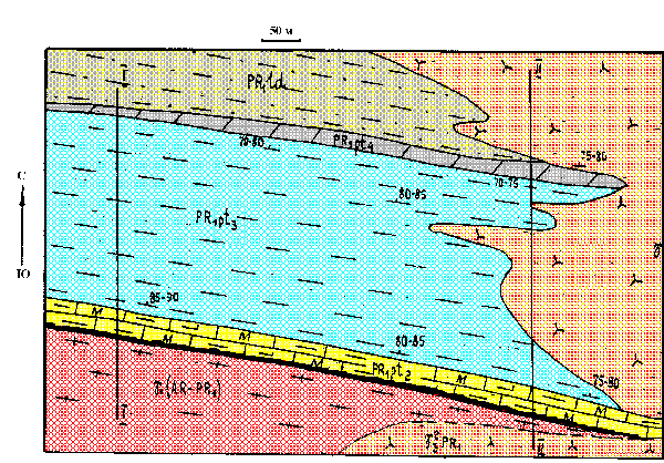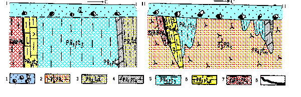 Основоное месторождение расположено в Северном Приладожье на территории Питкярантского района Республики Карелия в 15 км к северо-западу от г. Питкяранта и в 250 км от Петрозаводска. Ближайшая железнодорожная станция Койрин-Оя находится в 1.5 км к югу от месторождения на линии Петрозаводск-Янисъярви-С.Петербург с выходом на магистраль Мурманск-С.Петербург через г.г. Питкяранта и Лодейное Поле. В районе широко развита сеть автомобильных дорог республиканского значения, выходящих на шоссе Питкяранта-Петрозаводск. Основная водная магистраль - Ладожское озеро - находится в 5.5 км южнее месторождения и входит в систему Беломорско-Балтийского канала, пропускающего суда типа река-море. В г. Питкяранта имеется причал, используемый для отгрузки щебня. В восточной части месторождения проходит линия электропередач 1 класса напряжением 110 кВ и местная ЛЭП напряжением 6 кВ. 1-четвертичные отложения 2-граниты рапакиви (2 фаза) З-кварциты, полевошпат-биотитовые сланцы 4-кальцuфupы, мpaморы 5-полевошпатамфиболовые , графитсодержащие кварц-биотитовые скарны 6- пироксеновые , гранатовые, гранат-пироксеновые, магнетит-пироксеновые скарны 7-гнейсо-граниты |