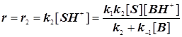 Во второй стадии протон от SH+ может переходить к молекуле H2O или к любым другим основным веществам, присутствующим в растворе. Природа веществ, передающих протоны субстрату, не играет первоочередной роли в формировании кинетического закона. Однако важное значение имеют вещества, которым SH+ передаёт протон на второй стадии.
