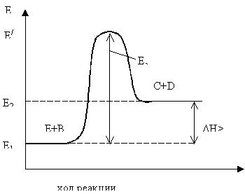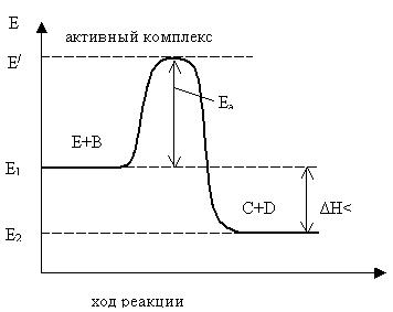 Примем средний уровень энергии молекул исходных веществ в системе равным Е1 , а среднюю энергию переходного состояния – Е| , то разность Е| - Е1 будет выражать энергию активации данной реакции – Еа . Энергия системы в переходном состоянии максимальна, а это значит, что активный комплекс крайне неустойчив. По ходу реакции он превращается в продукты взаимодействия С и D. В рассматриваемом примере средний уровень энергии молекул продуктов реакции Е2 ниже среднего уровня энергии молекул исходных веществ Е1 . Это означает, что процесс протекает с выделением энергии (реакция экзотермическая).