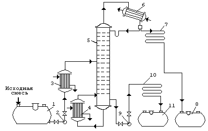 Рис.1 Принципиальная схема ректификационной установки: 1- ёмкость для исходной смеси ; 2, 9- насосы; 3- теплообменник-подогреватель; 4 - кипятильник; 5- ректификационная колонна; 6- дефлегматор; 7- холодильник дистиллята; 8- ёмкость для сбора дистиллята; 10- холодильник кубовой жидкости; 11- ёмкость для кубовой жидкости. Принципиальная схема ректификационной установки представлена на рис. 1. Исходную смесь из промежуточной емкости 1 центробежным насосом 2 подают в теплообменник 3, где она подогревается до температуры кипения. Нагретая смесь поступает на разделение в ректификационную колонну 5 на тарелку питания, где состав жидкости равен составу исходной смеси х F Стекая вниз по колонне, жидкость взаимодействует с поднимающимся вверх паром, образующимся при кипении кубовой жидкости в кипятильнике 4. Начальный состав пара примерно равен составу кубового остатка х W , т. е. обеднен легколетучим компонентом. В результате массообмена с жидкостью пар обогащается легколетучим компонентом. Для более полного обогащения верхнюю часть колонны орошают в соответствии с заданным флегмовым числом жидкостью (флегмой) состава хР , получаемой в дефлегматоре 6 путем конденсации пара, выходящего из колонны. Часть конденсата выводится из дефлегматора в виде готового продукта разделения - дистиллята, который охлаждается в теплообменнике 7 и направляется в промежуточную емкость 8 . |