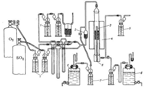 1 – дрексель, 2 – смеситель газов, 3 – контактная трубка, 4 – электрическая печь, 5 – поглотительная склянка с серной кислотой, 6 – аспиратор, 7 – анализатор, 8 – термопара.
