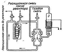 Метод осуществляется в условиях практического отсутствия в реакционной зоне перепадов концентраций и температур. Перемешивание в данной схеме достигается интенсивной циркуляцией (с помощью насосов) реакционной смеси через катализатор в замкнутом объеме при непрерывном поступлении и выведении газового потока, причем циркулирующего газа должно быть значительно больше вновь вводимого сырья. На рис. 2 представлен циркуляционный контур, состоящий из электромагнитного насоса 3, клапанной пробки 2 двойного действия и реактора 1, помещенного в печь.