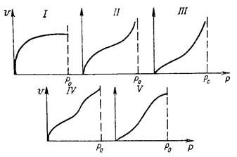 Изотерма I соответствует мономолекулярной изотерме Ленгмюра, II и III - мономолекулярной и полимолекулярным адсорбциям. IV и V сходны с изотермами II и III, но максимум адсорбции почти достигается при давлениях меньше P0 . Они отвечают случаям, когда мономолекулярная и полимолекулярная адсорбции сопровождаются капиллярной конденсацией. Большинство паров имеют форму изотермы адсорбции типа II, по которой, используя теорию БЭТ, можно определять удельную поверхность адсорбирующего твердого тела.