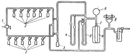 1 – кран для подачи азота, 2 – кюветы, 3 – ампула, 4 – масляный манометр, 5 – ртутный манометр, 6 – колба для хранения газа, 7 – кран, 8 – калиброванная колба, 9 – лампа термопары