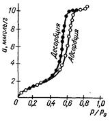 Рис. 5. Изотермы адсорбции и десорбции паров бензола на крупнопористом силикагеле при 20 0 С