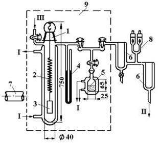1 - сорбционная колонна, 2 - кварцевая спираль, 3 - образец, 4 - манометр, 5 - термостатируемый источник паров, 6 - ловушки, 7 - катетометр, 8 - манометрические лампы, 9 - воздушный термостат. I - к ультратермостату, II - к высокому вакууму, III - воздух.