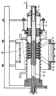 1 – шкала, 2, 7, 9 – втулки, 3 – гайка, 4 – сильфон, 5 – измерительная пружина, 6 – пробка, 8 – термопара, 10 – спираль, 11 – перфорированная тарелка, 12 – образец, 13 – теплоотражатель, 14 – кварцевый реактор, 15 – стержень, 16 – окно
