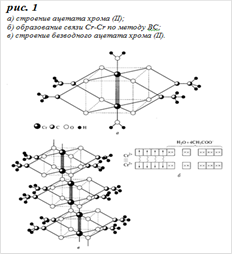 На наличие связи Cr-Cr указывает диамагнетизм этого соединения: в нем нет неспаренных электронов. Поскольку каждый ион Cr2+ содержит четыре неспаренных электрона, связь имеет кратность 4. Именно поэтому расстояние Cr-Cr в ацетате (0,230 нм) оказывается короче, чем в металлическом хроме (0,256 нм). Атомы хрома соединены друг с другом также четырьмя бидентатными мостиковыми ацетатными группами. Координационную сферу каждого атома хрома дополняет молекула воды.