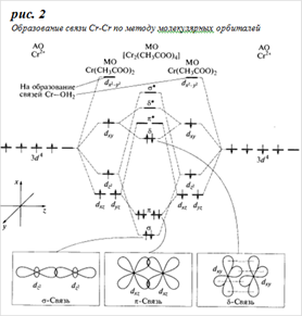 По методу валентных связей (ВС) четырехкратная связь Cr-Cr образуется в результате объединения неспаренных 3 d - электронов двух ионов хрома в четыре электронные пары, принадлежащие совместно обоим атомам. Вакантные орбитали ионов Cr2+ выступают в качестве акцепторов для образования пяти ковалентных связей с ацетатными группами и молекулами воды. В образующейся частице все электроны спарены, т.е. она является диамагнитной (см. рис 1 (б)) . При нагревании в вакууме до 120°С ацетат хрома теряет воду, превращаясь в коричневый порошок, в котором кластеры Cr2 (CH3 COO) 4 связаны между собой дополнительным взаимодействием атомов хрома с атомами кислорода соседних ацетатных групп (см. рис 1 (в)) . Образование связи Cr-Cr по методу молекулярных орбиталей (МО) представлено на рис.2 . Для простоты рассмотрено взаимодействие двух фрагментов молекулы состава Cr (CH3 COO) 2 , каждый из которых имеет форму плоского квадрата, что видно из расщепления исходных d- орбиталей хрома. Из пяти d -орбиталей каждого фрагмента четыре идут на образование связи Cr-Cr, а одна - на образование σ-связи с молекулой воды. Из восьми d -орбиталей, предоставленных в общее пользование двумя атомами хрома, образуются восемь молекулярных орбиталей (МО) - две из них σ-типа, четыре - π-типа и две δ-типа. Электронами заполнены четыре связывающие МО, что обусловливает образование четырехкратной связи Cr-Cr.
