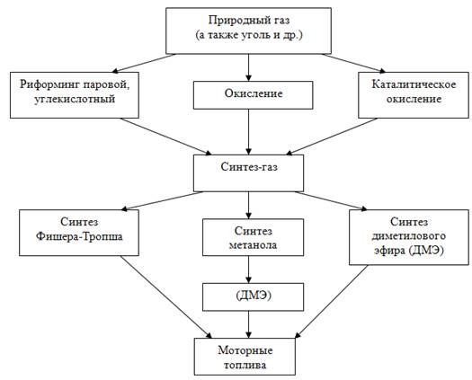 Синтез диметилового эфира (ДМЭ) и бензина через диметиловый эфир – одно из новых направлений в области переработки природного газа и других источников углерода (уголь, древесные остатки и т.п.). Основные пути переработки метана в моторные топлива показаны на схеме 1. Как видно из схемы, синтез ДМЭ вписывается в схему переработки природного газа как путь, альтернативный синтезу метанола.