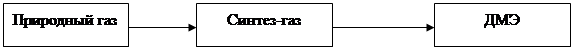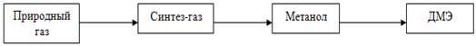 Природный газ является наиболее простым и доступным сырьем для синтеза диметилового эфира и, соответственно, процесс получения ДМЭ на базе природного газа имеет наилучшие экономические показатели. В настоящее время промышленное производство ДМЭ (наполнитель для аэрозолей) составляет ок. 150 тыс. т. в год и базируется на переработке метанола. Упрощенно схему производства ДМЭ на основе природного газа через синтез и последующую дегидратацию метанола можно представить в виде схемы 2.