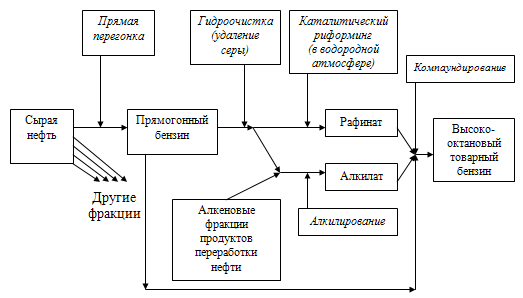 Данная технология имеет ряд существенных преимуществ перед стандартной технологией переработки нефти. По стандартной схеме нефть поступает в блок первичной перегонки, где она разделяется на бензиновую, керосиновую, дизельную фракции, тяжелый вакуумный газойль и гудрон. Каждая из этих фракций далее подвергается облагораживанию по своей технологической схеме. Так, например, для производства высокооктанового бензина (схема 4) прямогонный бензин подается на гидроочистку и далее одна часть направляется на риформинг для получения рафината (концентрат ароматических углеводородов), а другая часть – на стадию алкилирования. Путем компаундирования получают высокооктановый бензин. В случае получения зимнего дизельного топлива прямогонная дизельная фракция должна пройти стадии гидроочистки и депарафинизации.