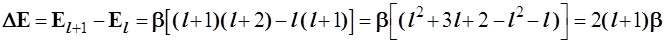 4.3.7.3. Подобно плоскому ротатору, энергетическая диаграмма жесткого ротатора демонстрирует расходящуюся систему уровней, однако значительно возрастает кратность вырождения. Расстояния между соседними уровнями увеличиваются с ростом квантового числа l, причем они линейно связаны с квантовым числом нижнего уровня l: