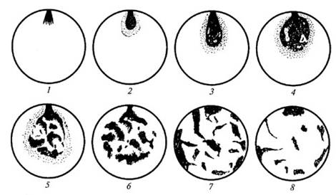 1,2— развитие факела впрыскиваемого топлива; 3 — появление на периферии