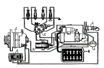 Эти требования обеспечиваются системой зажигания, состоящей из источников тока (аккумуляторная батарея и генератор), катушки зажигания, прерывателя-распределителя, конденсатора, свечей зажигания (по количеству цилиндров), выклю-чателя (замка) зажигания (имеет четыре положения), проводов высокого и низкого напряжения.