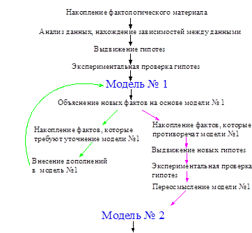 Процесс теоретического моделирования, как уже было сказано выше, осуществляется поэтапно: построение модели, изучение модели и экстраполяция. На каждом этапе можно выделить определенные действия, необходимые для его осуществления (рис 2). Модели могут дополняться, изменяться и даже заменяться новыми моделями. Такие процессы происходят, если исследователи сталкиваются с новыми фактами, противоречащими построенной модели. Новая модель – результат переосмысления противоречий старой модели и вновь полученных данных.