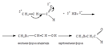 Акролеину, кротоновому альдегиду и другим непредельным соединениям с сопряженной двойной и карбонильными связями присущи реакции, свойственные алкенам и альдегидам. Взаимное влияние двойной связи и карбонильной группы находит отражение в некоторых особенностях, например: