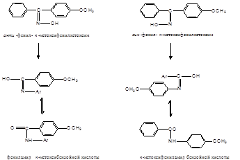 Из всех азотистых производных кетонов наибольший интерес представляют оксимы. Оксимы чисто ароматических несимметричных кетонов существуют в виде двух геометрических изомерных форм, син- и анти-. Син-формой принято считать изомер, содержащий меньший радикал в цис-положении с гидроксильной группой оксима. Более стойкой является анти-форма. Она получается из син-формы под действием кислот. Аналогичное явление известно и для оксимов ароматических альдегидов: