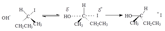 Представленная реакция является реакцией замещения, так как нуклеофил (ОН - ) вытесняет уходящую группу (I- ).