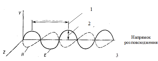 Рис. 1. Електромагнітна хвиля: 1- довжина хвилі; 2 – амплітуда; 3 – напрямок розповсюдження; Н – магнітна складова; Е – електрична складова