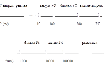 Спектр електромагнітного випромінювання. Сукупність всіх частот (довжин хвиль) електромагнітного випромінювання називають електромагнітним спектром. Інтервал довжин хвиль від 10-10 до 10-1 м розбивають на області (схема 1): ультрафіолетова (УФ) область займає діапазон ~10 – 380 нм; інфрачервона (ІЧ) область 750 – 105 нм; видиме світло, що використовується у найбільш розповсюджених методах аналізу, займає вузьку область 380 – 750 нм.