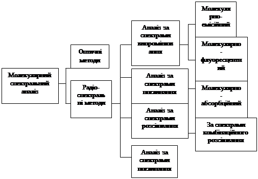 3. За об’єктами, що вивчають, спектроскопію поділяють на ядерну, атомну та молекулярну, до ядерної спектроскопії (що включає, власно кажучи, α –, β – та γ – спектроскопію) належить аналітична месбауеровська спектроскопія. До атомної спектроскопії відносять атомно–емісійну, атомно–флуоресцентну, атомно–абсорбційну, рентгенофлуоресцентну, ЕПР та ЯМР – спектроскопію. До молекулярної спектроскопії належать електронна молекулярна абсорбційна спектроскопія (в УФ та видимій областях спектра), ІЧ– спектроскопія, спектроскопія комбінаційного розсіяння, мікрохвильова та люмінесцентна спектроскопія.
