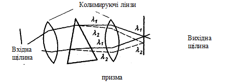 Розкладання світла призмою базується на його заломленні на межі поділу двох матеріалів, наприклад повітря та кварцу або повітря та скла. Випромінювання від джерела фокусується на вхідну щілину, зводиться в паралельний потік, що колимирується лінзою, та потрапляє на призму. Промені світлового потоку, потрапляючи на грань призми, відхиляються від прямолінійного шляху під кутом, що залежить від довжини хвилі (рис. 3).