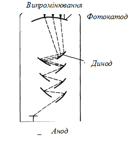 Найчастіше для прийому випромінювання використовують фотопомножувачі, що складаються з фотокатоду та кілька додаткових електродів (динодів), з’єднаних між собою (рис. 4). На кожен динод подається напруга на 90 В більша, ніж на попередній. Електрон, що вибитий з фотокатоду під дією фотону, потрапляє на перший динод та викликає випускання п електронів, які направляються до другого диноду та знову викликають емісію п електронів і т. д. Електрони, що випускаються динодами, називають вторинними. Загальна кількість електронів дорівнює пт , де т – число динодів. Нехай п = 4 та число динодів рівне 12, тоді загальна кількість електронів, що отримуються при попаданні на фотокатод одного-єдиного фотону, дорівнює 17·106 , що складає струм ~ 0,5 мА.