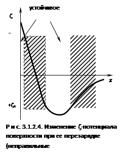При еще больших концентрациях многовалентные ионы перезаряжают коллоидную частицу и золь опять устойчивый. В этой зоне x-потенциал опять выше критического значения, но обратен по знаку частицам исходного золя. Наконец, при высоком содержании исходного электролита многовалентные ионы снова снижают значение x-потенциала ниже критического и снова происходит окончательная коагуляция.