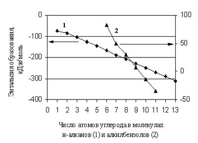 Рис. 1.1. Зависимость энтальпии образования н-алканов и алкил бензолов от числа атомов углерода в их молекулах