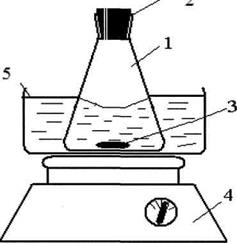 1 - колба с исследуемых растворов; 2 - корковая пробка; 3 - теловращение; 4