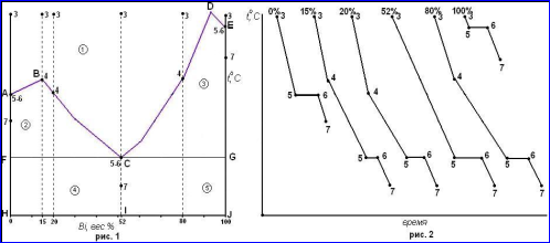 Кривые охлаждения построены на рисунке 2. Все пробы, одинаковые по массе, но разные по концентрации, характеризуются точкой 3. Температурные остановки 5-6 на кривых охлаждения при 0 и 100% Bi указывают на то, что чистые компоненты кристаллизуются при постоянной температуре t(A) и t(E) (С = 1 – 2 + 1 = 0). Участки 3-5 и 6-7 соответствуют охлаждению чистых компонентов в жидком и твёрдом состояниях соответственно (С = 1 – 1 + 1 = 1). Кривые охлаждения 15, 20 и 80%: участок 3-4 отвечает охлаждению состава (С = 2 – 1 + 1 = 2). Точке 4 соответствует температура начала кристаллизации одного из компонентов (15, 20% - Te, 80% - Bi). За счёт выделяющейся теплоты кристаллизации в точке 4 наблюдается излом, но температура кристаллизации расплава не сохраняется постоянной, так как его состав непрерывно меняется, а число степеней свободы равно 1 (С = 2 – 2 + 1 = 1). На участке 4-5 в системе продолжается кристаллизация Te (15 и 20%) и Bi (80%) и каждой температуре соответствует определённый состав насыщенного расплава, который постепенно меняется до эвтектического. Расплав, соответствующий точке 5 становится насыщенным относительно обоих компонентов (точка Cна диаграмме), начинается кристаллизация эвтектики, состоящей из кристаллов Te и Bi. Число степеней свободы уменьшается до нуля (С = 2 – 3 + 1 = 0) и температура остаётся постоянной до полного затвердевания смеси (участок 5-6). Продолжительность температурной остановки тем больше, чем ближе состав исходного расплава к составу эвтектики. Участок 6-7 соответствует охлаждению двухфазной системы в твёрдом состоянии (С = 2 – 2 + 1 = 1).