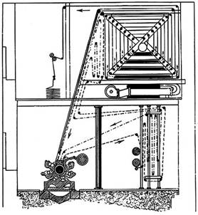 Многие виды крашения - особенно гладкого и в светлых тонах - не допускают сушки ткани соприкосновением с горячими поверхностями из-за образования полосатости. Для сушки таких тканей использовался горячий воздух. На рисунке 2 представлена схема машины, в которой ткань высушивается, совершая длинный путь в горячем воздухе и около горячих плит. По этой же схеме создавалась воздушная сушилка при ситцепечатных машинах, без чего было бы невозможно ситцепечатание [6].