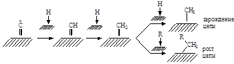 с последующим образованием поверхностных –СН, –СН2 и –СН3 групп или разрыв связи СО в адсорбированном СО под действием Н2 или Надс, например,