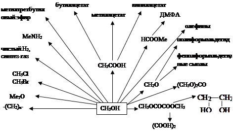 Интересные направления использования метанола – синтез чистого Н2, синтез олефинов. Очень упрощенное “метанольное дерево” в органическом синтезе имеет вид