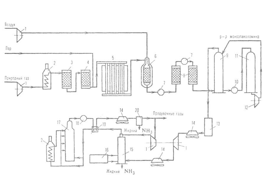Рис. 3. Агрегат синтеза аммиака мощностью 1360 т/сут: 1-компрессоры; 2-подогреватели; 3-аппарат для тарирования сераорг. соед.; 4-адсорбер H2 S; 5-трубчатая печь (первичный риформинг); 6-шахтный конвертор (вторичный риформинг); 7-паровые котлы; 8-конверторы СО; 9-абсорбер СО2 ; 10-кипятильник; 11 -регенератор р-ра моноэтаноламина; 12-насос; 13-аппарат для гидрирования остаточных СО и СО2 ; 14-воздушные холодильники; 15-конденсац. колонна; 16-испаритель жидкого NH3 (для охлаждения газа и выделения NH3 ); 17-колонна синтеза NН3 ; 18-водоподогреватель; 19-теплообменник; 20-сепаратор.