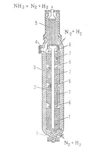 Рис. 4. Колонна синтеза аммиака: 1-люк для выгрузки катализатора; 2-центр, труба; 3-корпус; 4-люк для загрузки катализатора; 5 -теплообменник; 6-трубы для ввода холодного газа; 7 - катализатор.